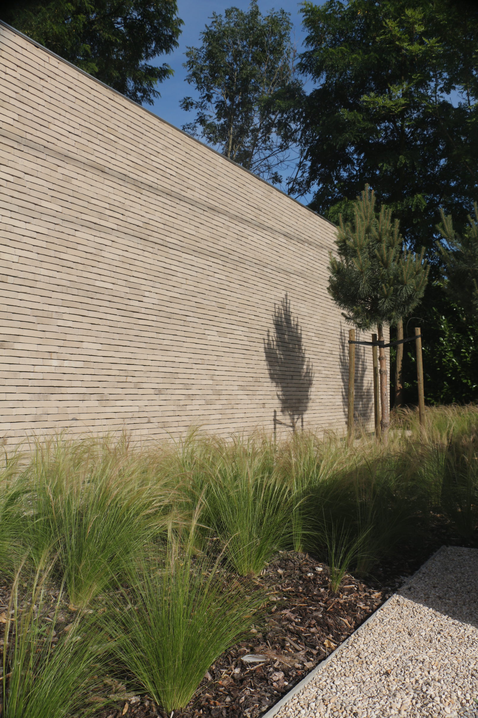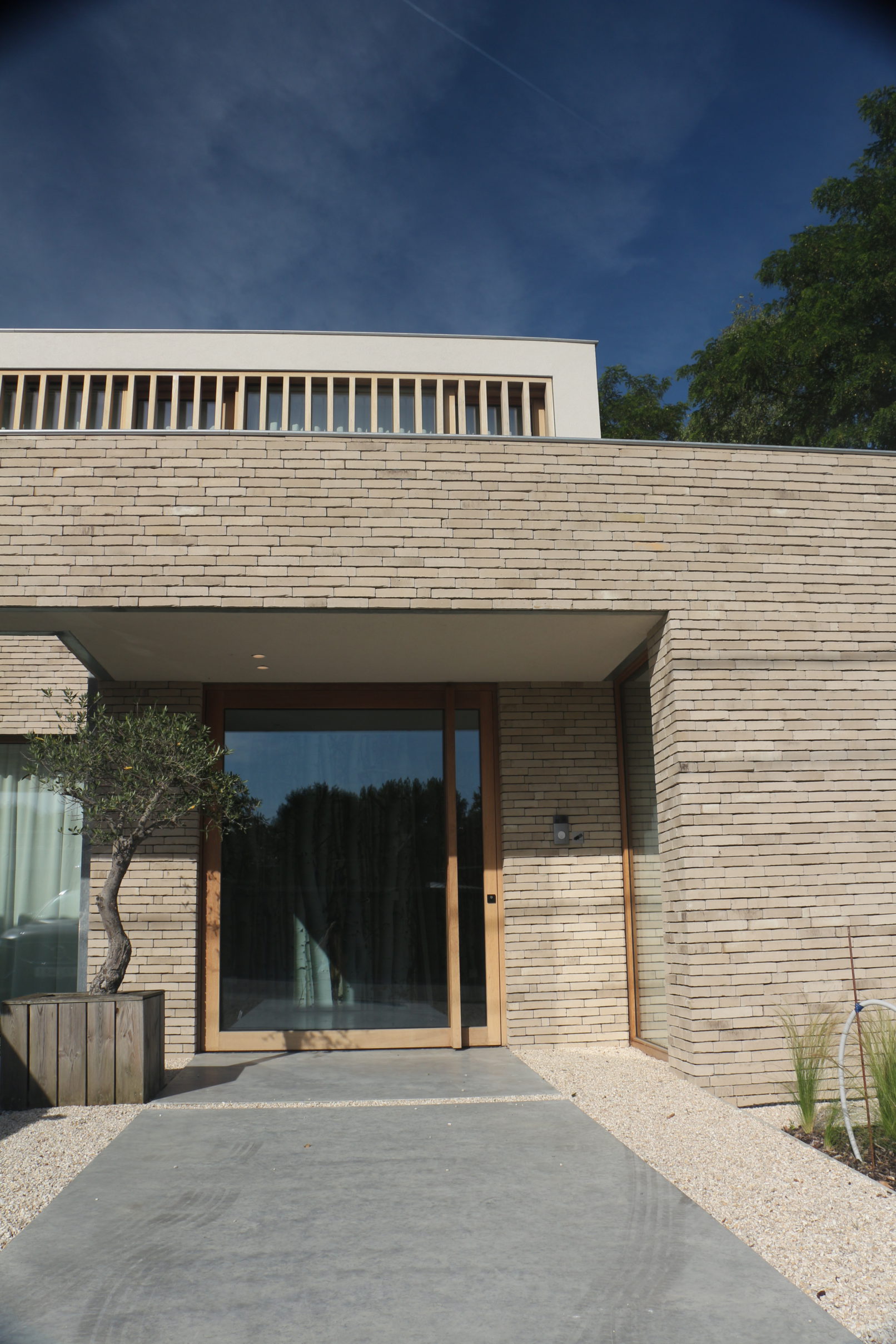 de wens van de bouwheer voor een horizontale éénlaagse patiowoning met veel open zichten werd als leidraad genomen. gelet op de smaller wordende vorm van het perceel naar achteren toe werd het slaapgedeelte op de verdieping ondergebracht.