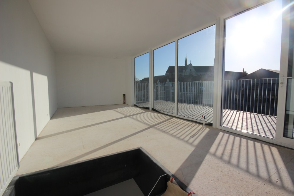 als toemaatje werd er een klein volume in houtstructuur bovenop gebouwd die resulteert in een unieke penthouse met prachtige zichten op de dijle en binnenstad.