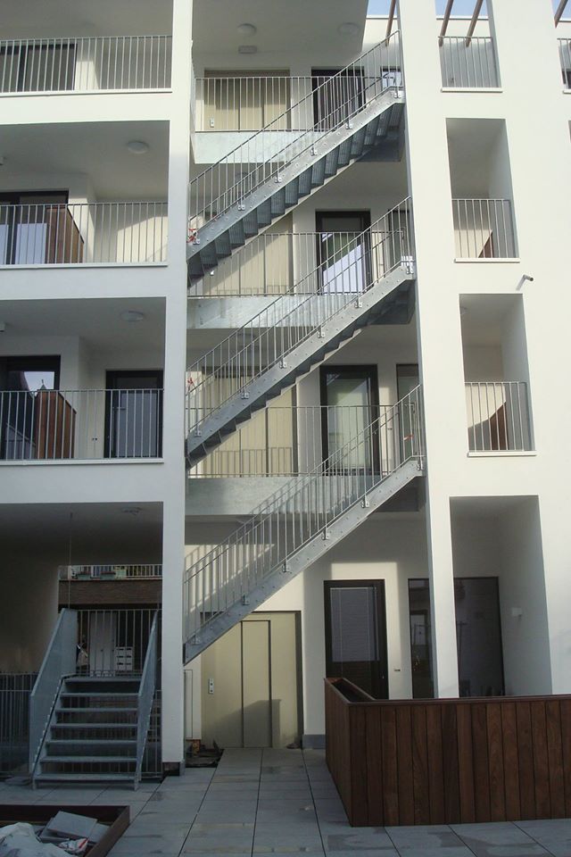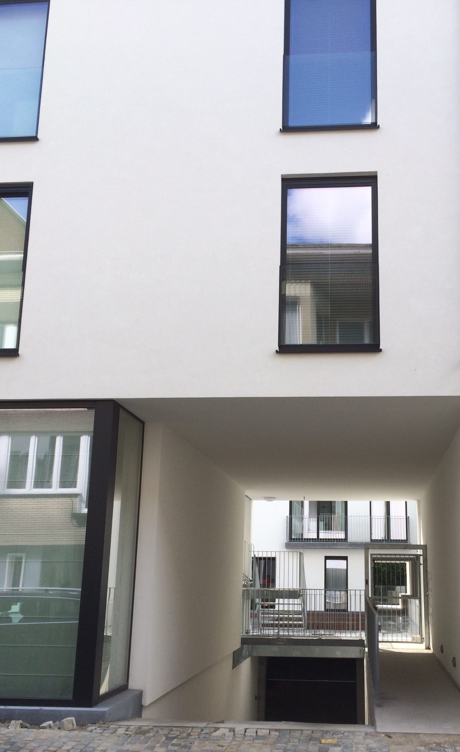de circulatie van het voorste bouwblok gebeurt via een trappenstructuur via het binnenplein.
