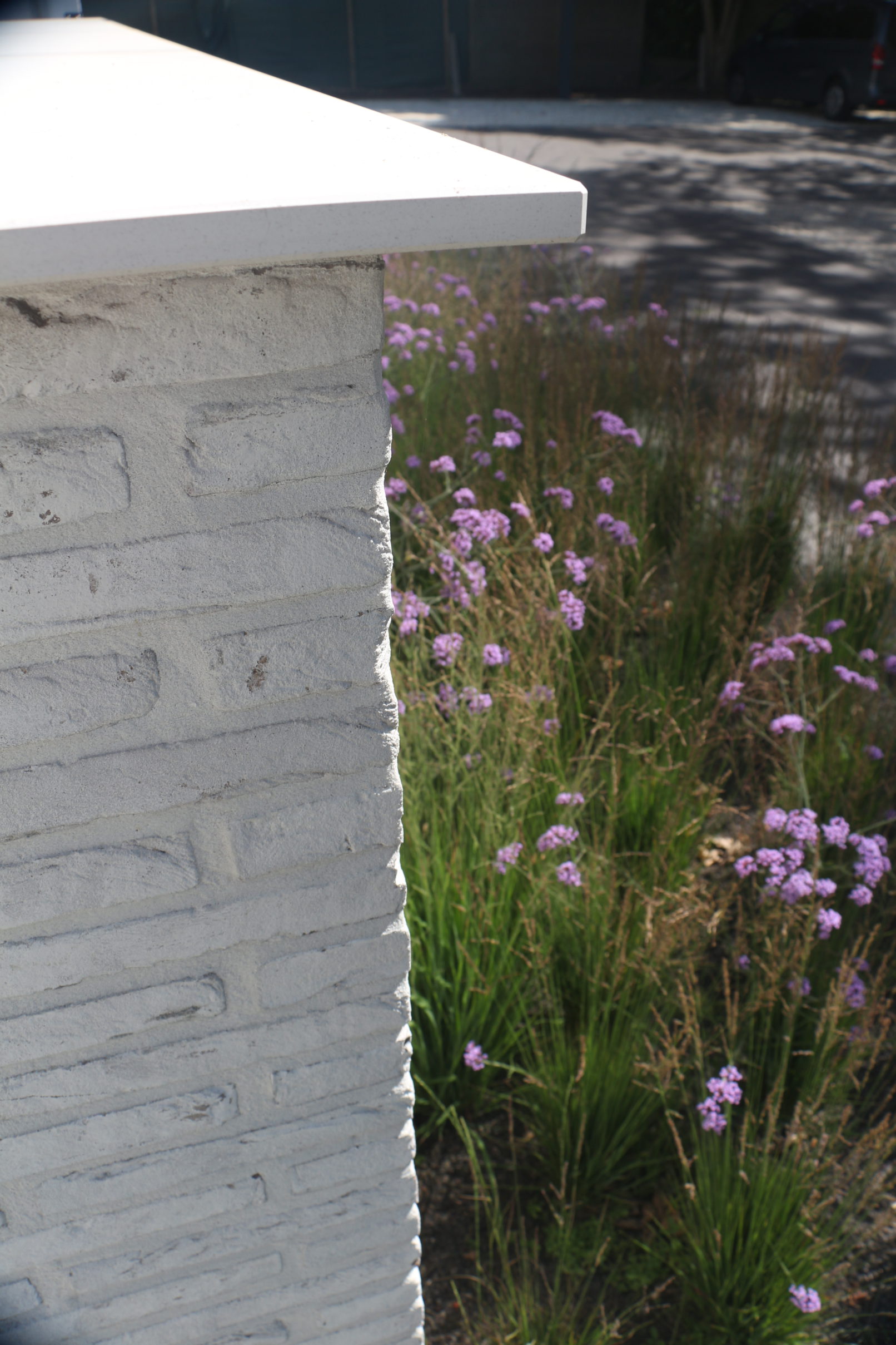de patio aan de voorzijde ligt aan de zuidkant en wordt afgeschermd door een patiomuur die zorgt voor privacy.